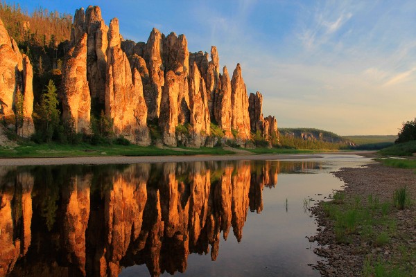 В самом сердце Центральной Якутии протекает уникальная по красоте и чистоте река Синяя, которая по праву считается Жемчужиной Сибири. Столбы реки Синяя — это 37 групп скал, расположившихся на поротяжении 120 километров до устья.