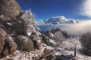 Конечно, это не совсем сугробы, а камни, которые засыпало снегом. Но он словно окутывал их своим покрывалом, каждый камень был скрыт под снежной массой, и это смотрелось непередаваемо красиво. Некогда тяжелые булыжники сейчас стали невесомыми облаками. Очень эффектно.